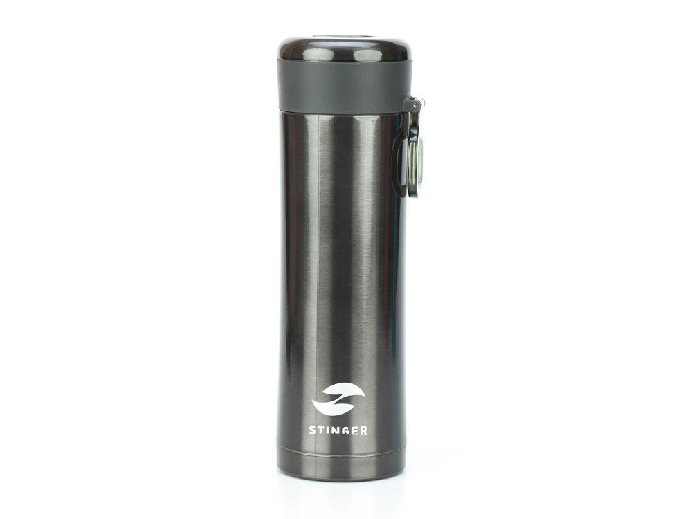 ТЕРМОКРУЖКА STINGER 0,42 Л СВОЙСТВА: Тип термоса: для горячих и холодных напитков Материал корпуса: двухслойная нержавеющая пищевая сталь 18/8 Тип крышки: закручивающаяся Материал крышки: пластиковая без бисфенола А (BPA free) Объём термоса: 0,42 л Размер термоса: 7,5 х 6,9 х 22,2 см Вес термоса: 346 г Цвет: чёрный металлик ХАРАКТЕРИСТИКИ: Сохраняет температуру: Горячий напиток: через 6 часов температура наполняемой жидкости 71℃ Холодный напиток: через 6 часов температура наполняемой жидкости 7,5 ℃ ОСОБЕННОСТИ: Ситечко для заварки чая или кофе Кольцо для удобства переноски Подходит под любые автомобильные подстаканники